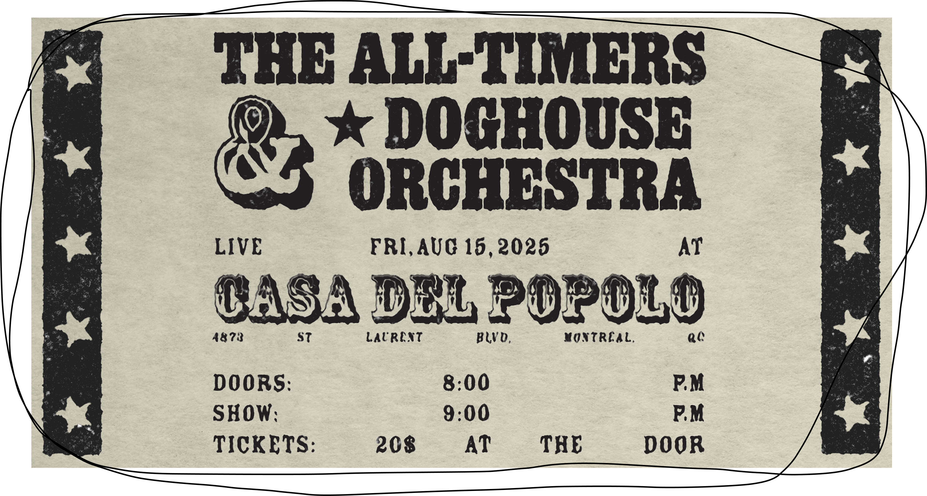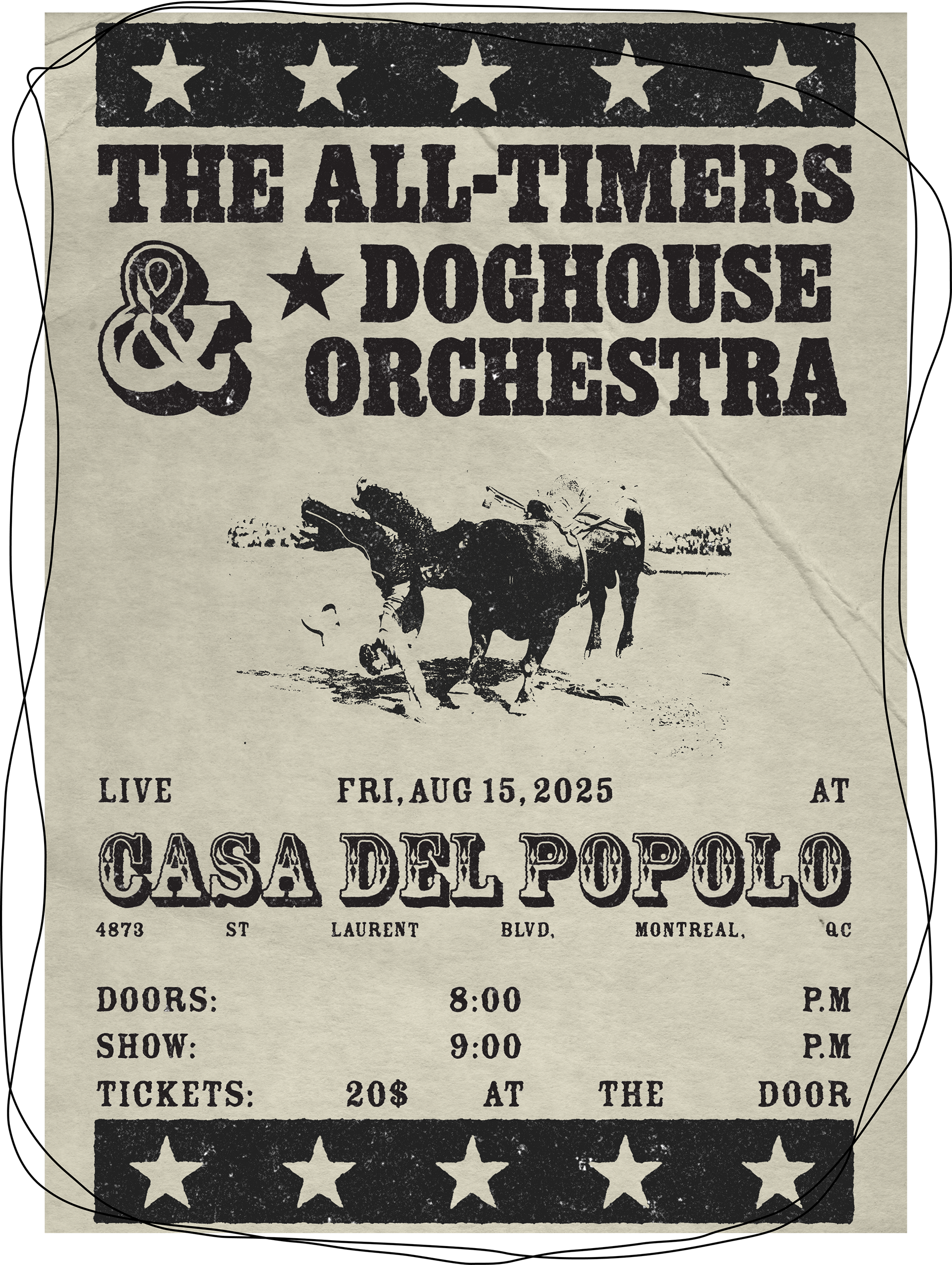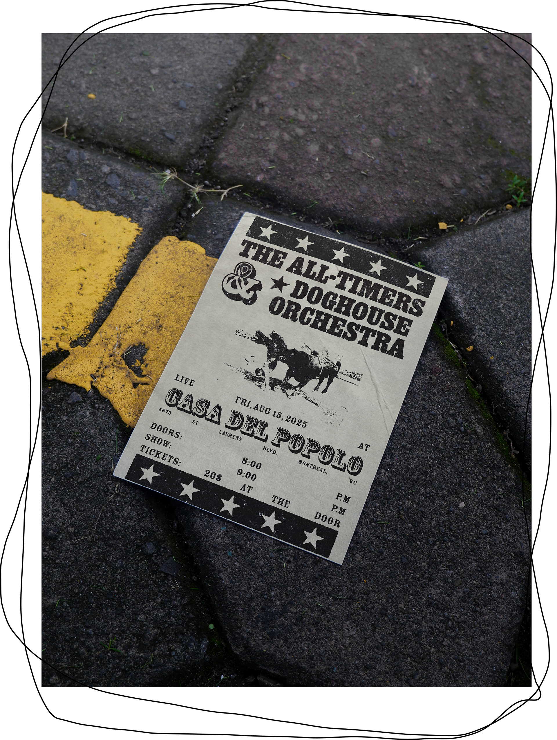 Alex Ginella & The All Timers create country folk rock music, and I wanted to embody this through the posters. I had creative freedom, with one exception, the posters needed to have a Western feel. Listening to Ginella's tunes inspired me to create something unique, something you wouldn’t see all over the city. In the end, Ginella loved the posters and was thrilled with the results.
